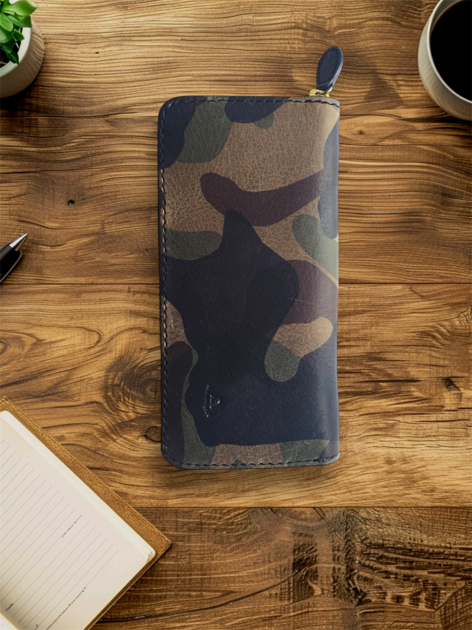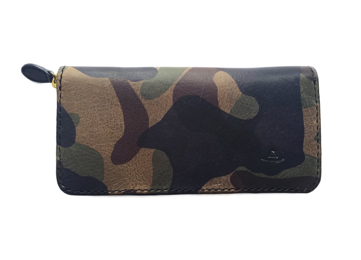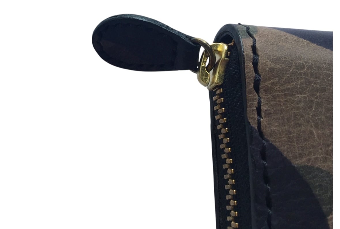 カモフラージュ革のラウンドファスナーウォレット。内部は6ポケッットカードケース×2、お札が曲がらずに収納できるスペースが3か所があり使いやすい仕様となっています。