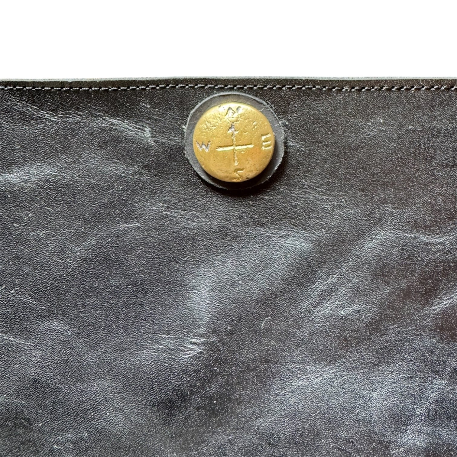 一番のポイントは、フロントに配置された存在感のある真鍮色のコンチョボタン。