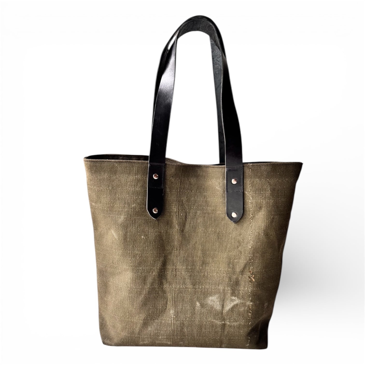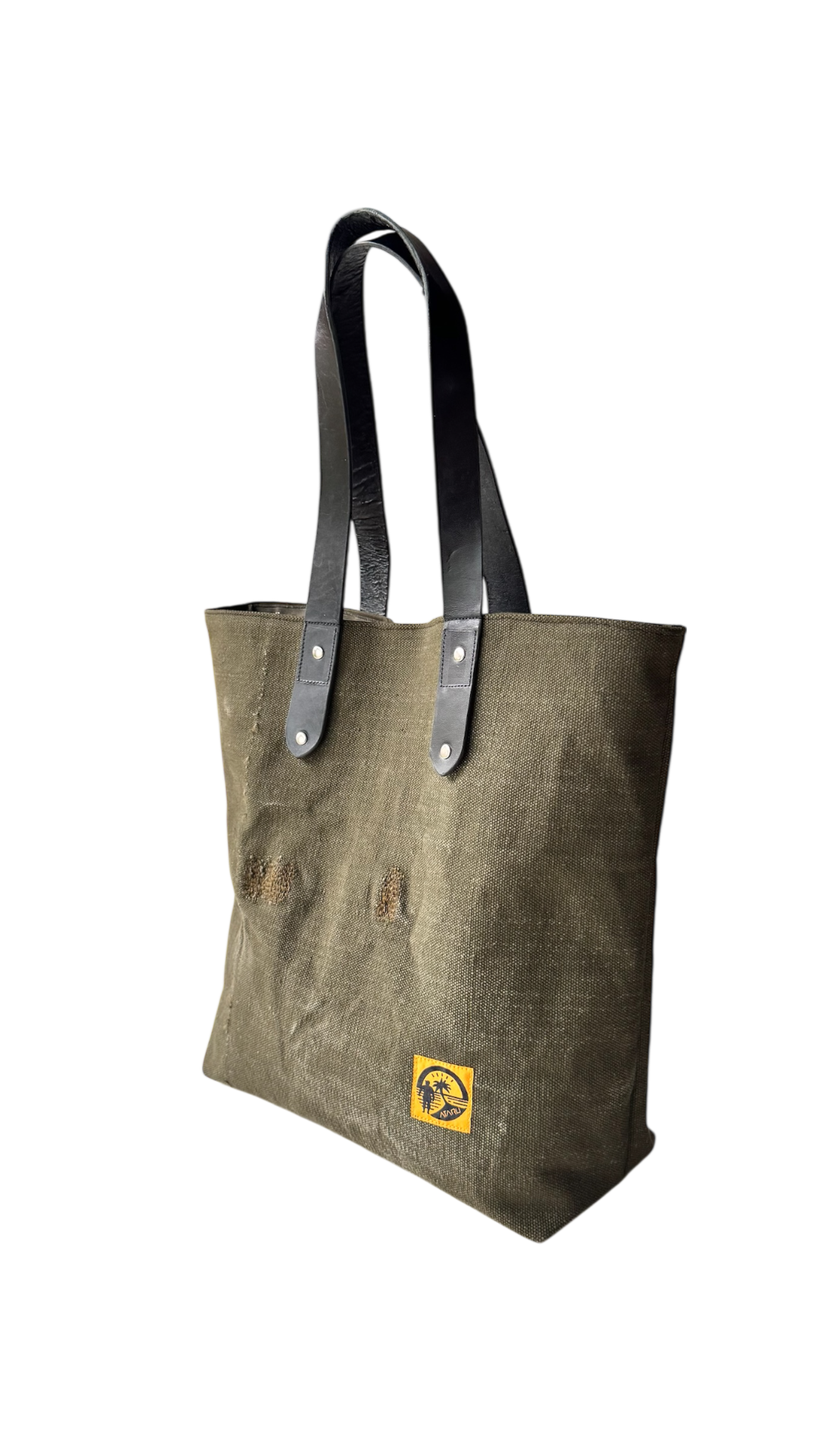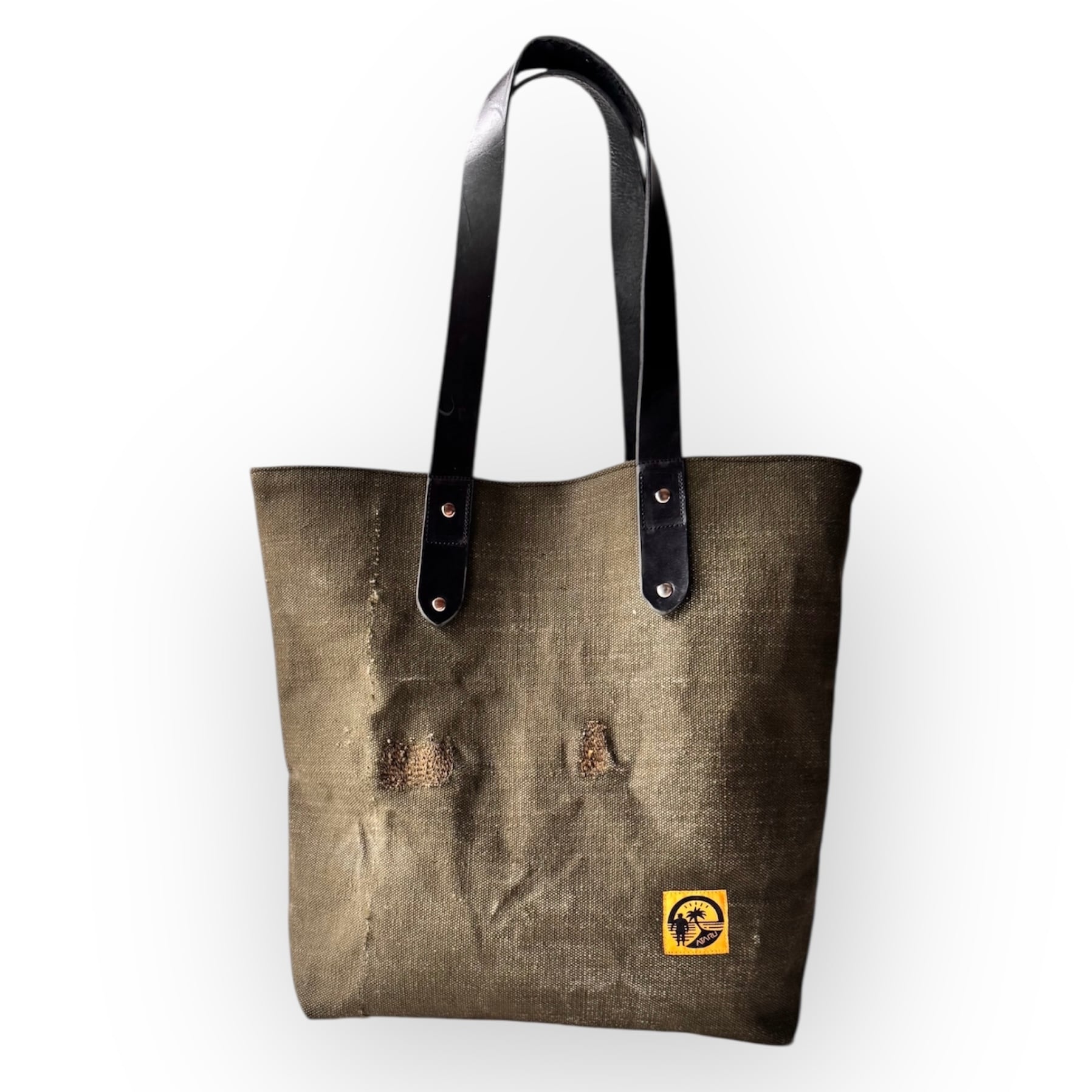 素材:表地:米軍デッドストック生地 / 裏地:リサイクルテント生地 / 持ち手:本革(使用上は問題ないですが、ハギレのためキズやムラがあります。)