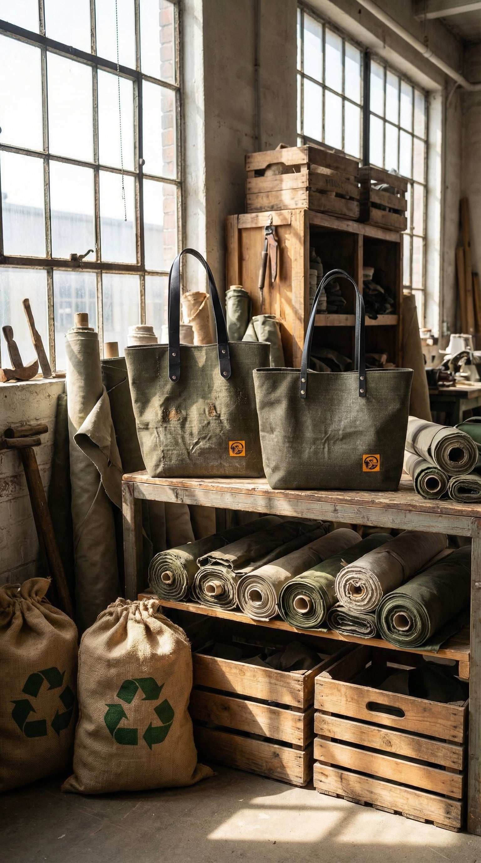 Material: US Military Deadstock Fabric, Recycled Tent Fabric, Recycled Leather