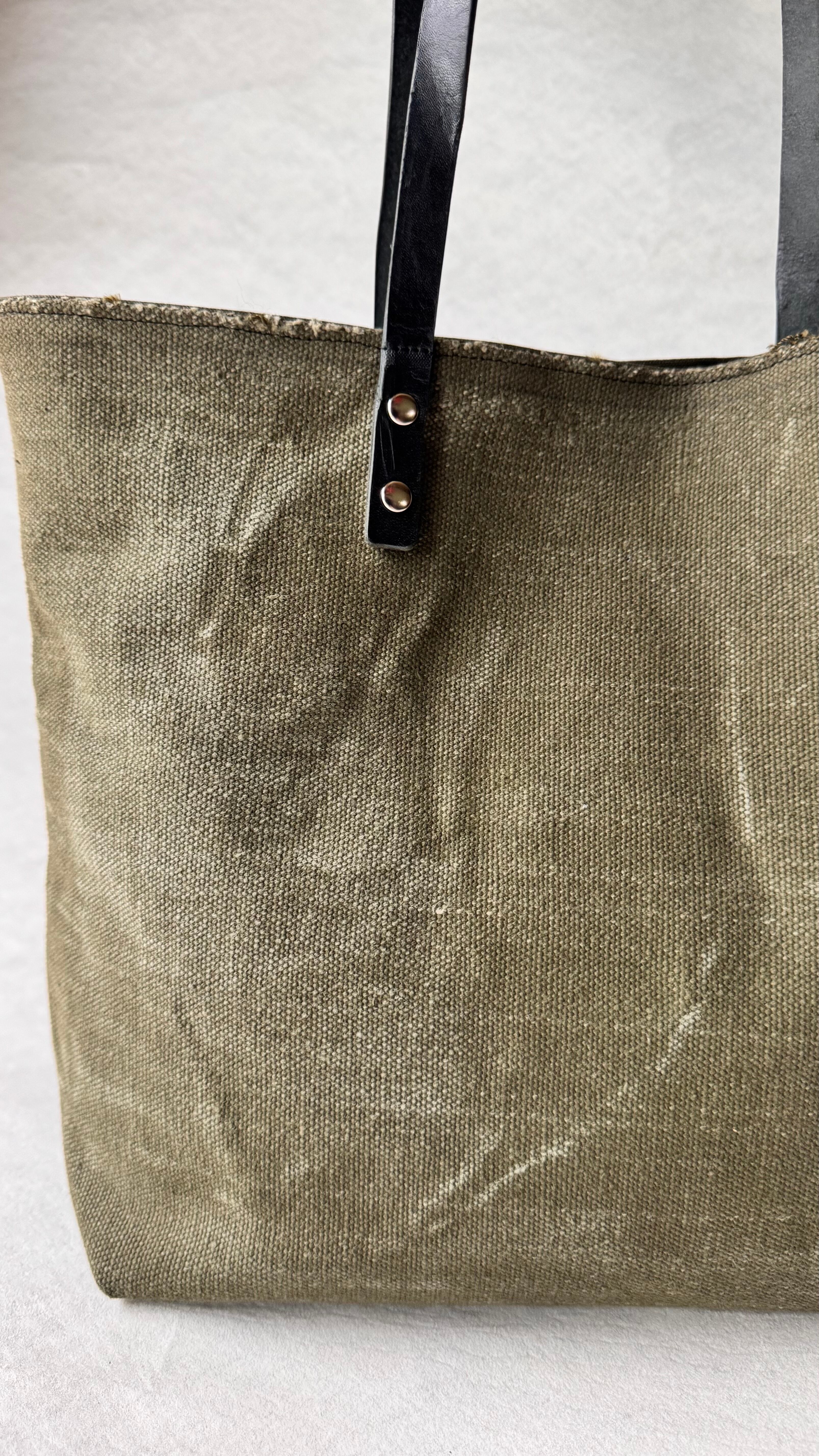 素材:表地:米軍デッドストック生地 / 裏地:リサイクルテント生地 / 持ち手:本革(使用上は問題ないですが、ハギレのためキズやムラがあります。)